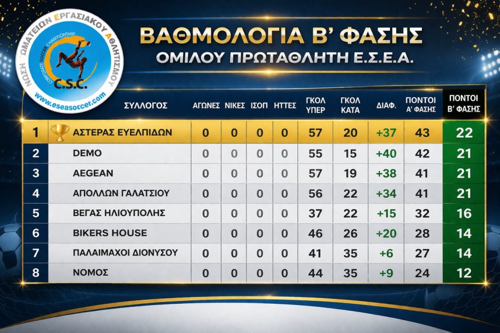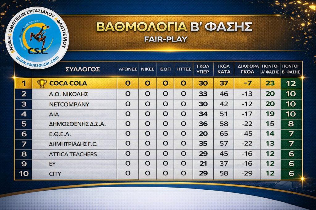 ΒΑΘΜΟΛΟΓΙΑ Β ΦΑΣΗΣ FAIR PLAY – ΠΡΩΤΑΘΛΗΜΑΤΟΣ 2025-2026 By Nikos29 Μαρτίου, 202629 Μαρτίου, 2026ΠΡΟΓΡΑΜΜΑ ΚΥΠΕΛΛΟΥ 2025-2026, ΠΡΟΓΡΑΜΜΑ ΠΡΩΤΑΘΛΗΜΑΤΟΣ 2025-2026