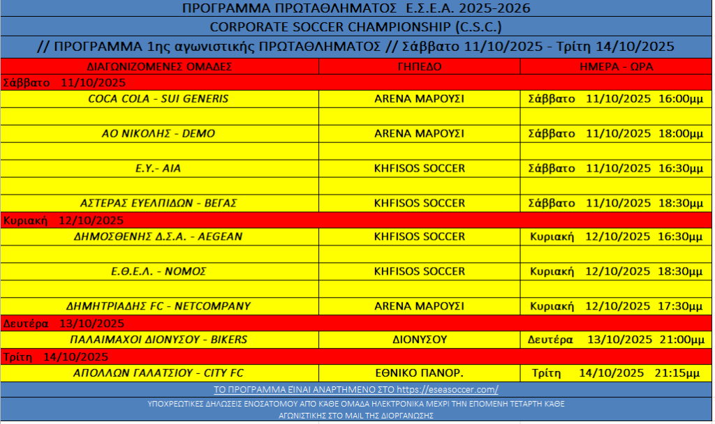 ΠΡΟΓΡΑΜΜΑ 1ης ΑΓΩΝΙΣΤΙΚΗΣ ΠΡΩΤΑΘΛΗΜΑΤΟΣ 2025-2026 By Nikos9 Οκτωβρίου, 20259 Οκτωβρίου, 2025ΠΡΟΓΡΑΜΜΑ ΠΡΩΤΑΘΛΗΜΑΤΟΣ 2025-2026