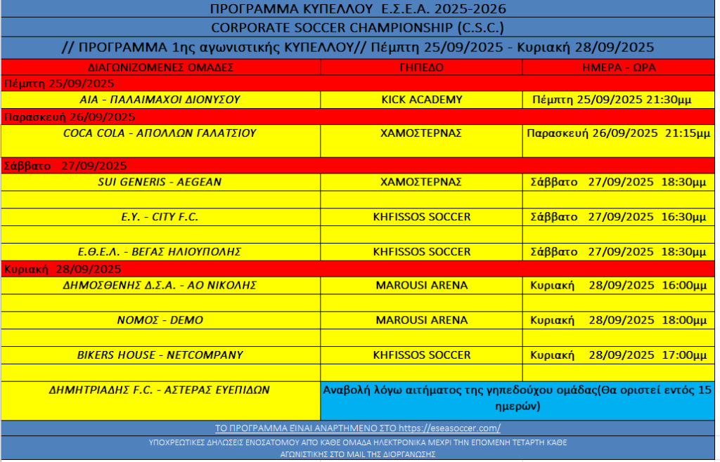 Πρόγραμμα 1ης Αγωνιστικής Κυπέλλου 2025-2026 By Nikos22 Σεπτεμβρίου, 202530 Σεπτεμβρίου, 2025ΠΡΟΓΡΑΜΜΑ ΚΥΠΕΛΛΟΥ 2025-2026