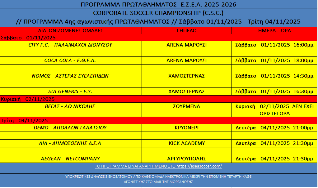 ΠΡΟΓΡΑΜΜΑ 4ης ΑΓΩΝΙΣΤΙΚΗΣ ΠΡΩΤΑΘΛΗΜΑΤΟΣ 2025-2026 By NikosOctober 28, 2025October 28, 2025ΠΡΟΓΡΑΜΜΑ ΠΡΩΤΑΘΛΗΜΑΤΟΣ 2025-2026